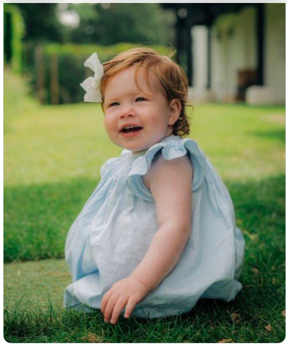 Така или иначе момиченцето изглежда много щастливо на рождения си ден и се усмихва широко. От фотографията става ясно, че също като батко си Арчи, Лилибет е наследила рижавите коси на принц Хари. Рожденичката позира с голяма бяла панделка, облечена в бледосиня рокличка.