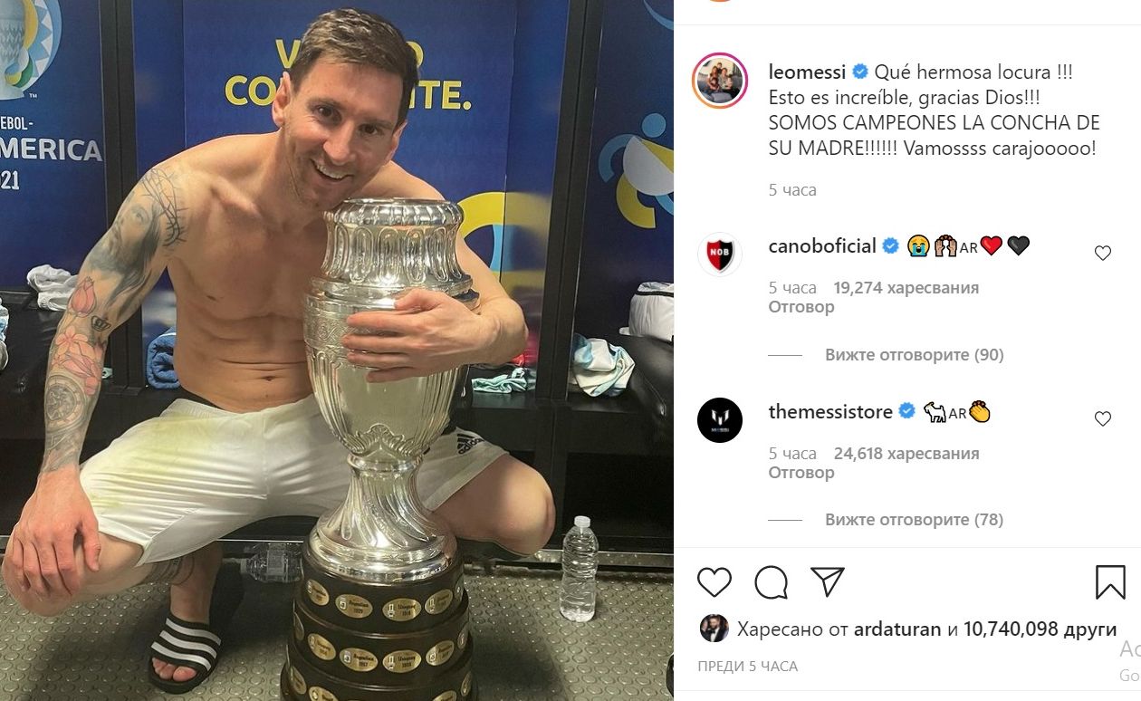 Суперзвездата на Аржентина Лионел Меси беше във възторг от спечеления трофей в Копа Америка. Капитанът на "гаучосите" публикува три снимки в профила си в Инстаграм, в които изразява радостта си от титлата, която толкова дълго чакаше.