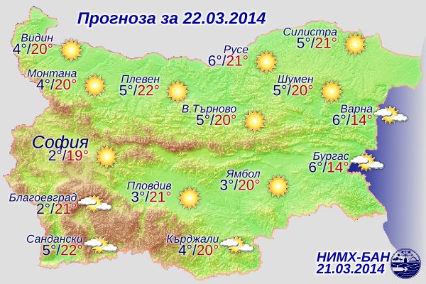 След обяд от запад ще се появи висока облачност, която няма да промени слънчевия характер на времето. Максималните температури ще са между 17° и 22°. В София около 19°. Атмосферното налягане ще се понижава и през деня ще е близко до средното за месец март.