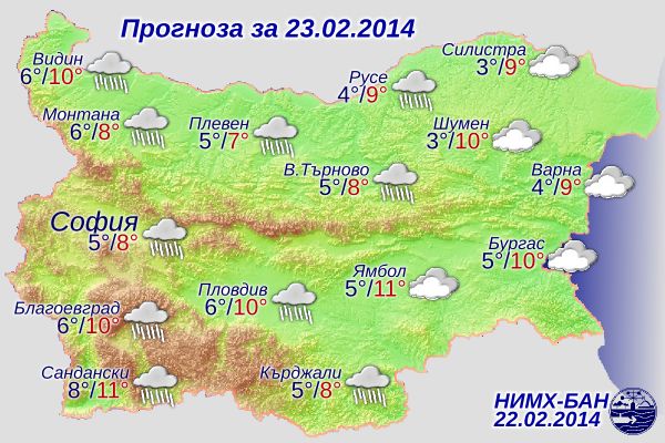 Дъждовете няма да са обилни, но ще залеят почти цяла България (вижте схемата). Вятърът ще е от север-североизток – слаб, в Източна България до умерен. Минималните температури ще са между 3° и 8°, максималните между 6° и 11°, в София около 8°.