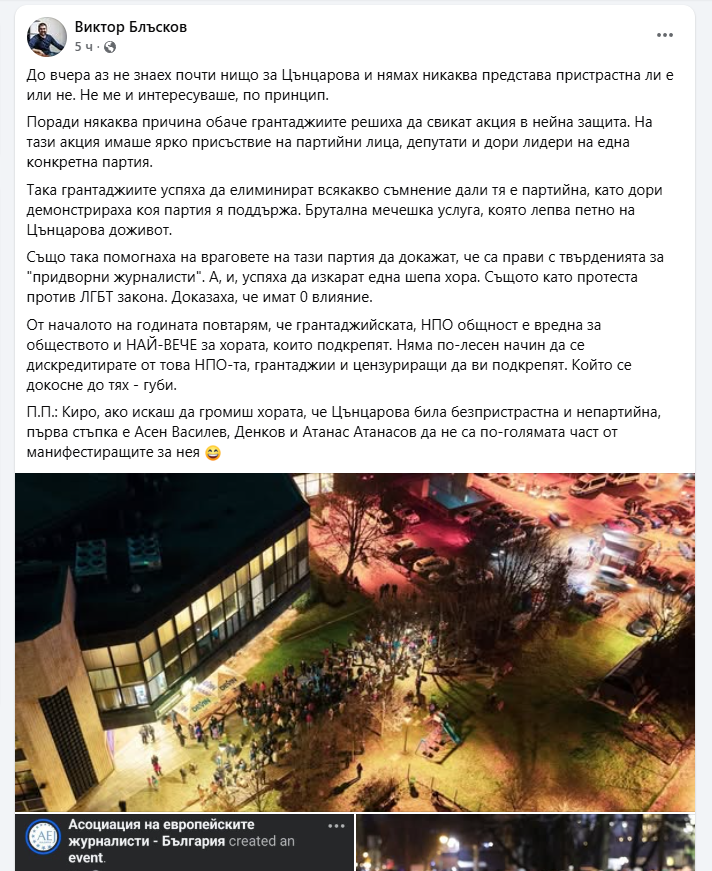 Така грантаджиите успяха да елиминират всякакво съмнение дали тя е партийна, като дори демонстрираха коя партия я поддържа. Брутална мечешка услуга, която лепва петно на Цънцарова доживот", заяви Блъсков в социалната мрежа.