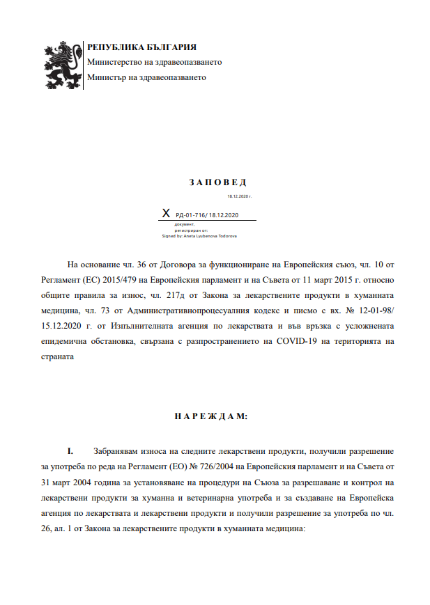 Настоящата заповед, с която се ограничава износът на определени лекарствени продукти се издава на основание чл. 217д, от Закона за лекарствените продукти в хуманната медицина и във връзка с постъпило писмо с вх. 12-01-98/15.12.2020 г. от Изпълнителната агенция по лекарствата предвид усложнената епидемична обстановка, свързана с разпространението на COVID-19 на територията на страната. Според писмото от изпълнителния директор на ИАЛ, към настоящия момент задължително използваните лекарствени продукти, които медицинските специалисти от болничната и извънболничната помощ прилагат при лечението на болни от коронавирусната инфекция, са от различни анатомо-терапевтични групи: