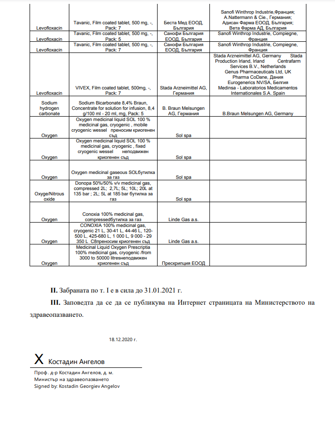 Със своя заповед, издадена днес, 18 декември, министърът на здравеопазването проф. Костадин Ангелов забранява износа на лекарствени продукти, които влизат в терапевтичните схеми за лечение на заболяването COVID-19 и се прилагат в болничната и извънболничната помощ.