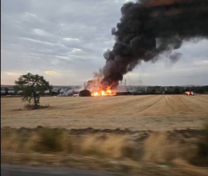 Малко преди да навлезе в Симеоновград, на 10 км, дерайлират няколко вагона, неизвестно колко до момента, на частна композиция с цистерни. Те са пълни с нафта. От дерайлирането се получава самозапалване на дизелово гориво в между 5 и 8 вагона. Веднага пристигат службите за противопожарна защита, още в 6 ч пожарът се локализира. Това каза пред бТВ министърът на транспорта Гроздан Караджов. Той уточни, че към момента пожарът върви към пълно потушаване.