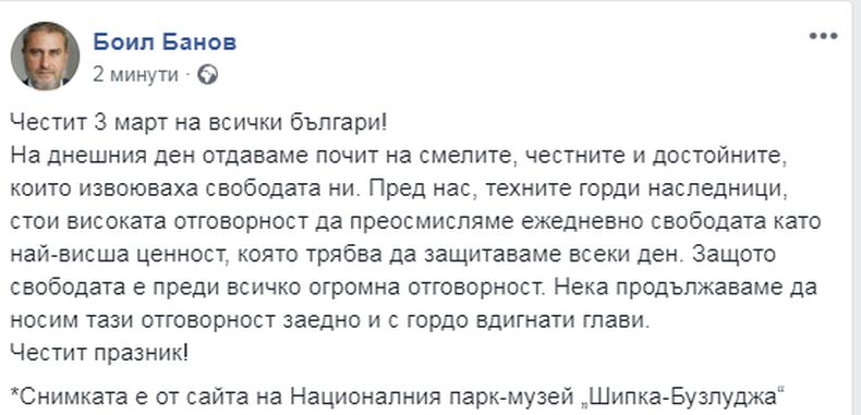 Министърът на културата Боил Банов честити националния празник. Да отдадем почит на смелите, честните и достойните, които са извоювали свободата ни, написа той.