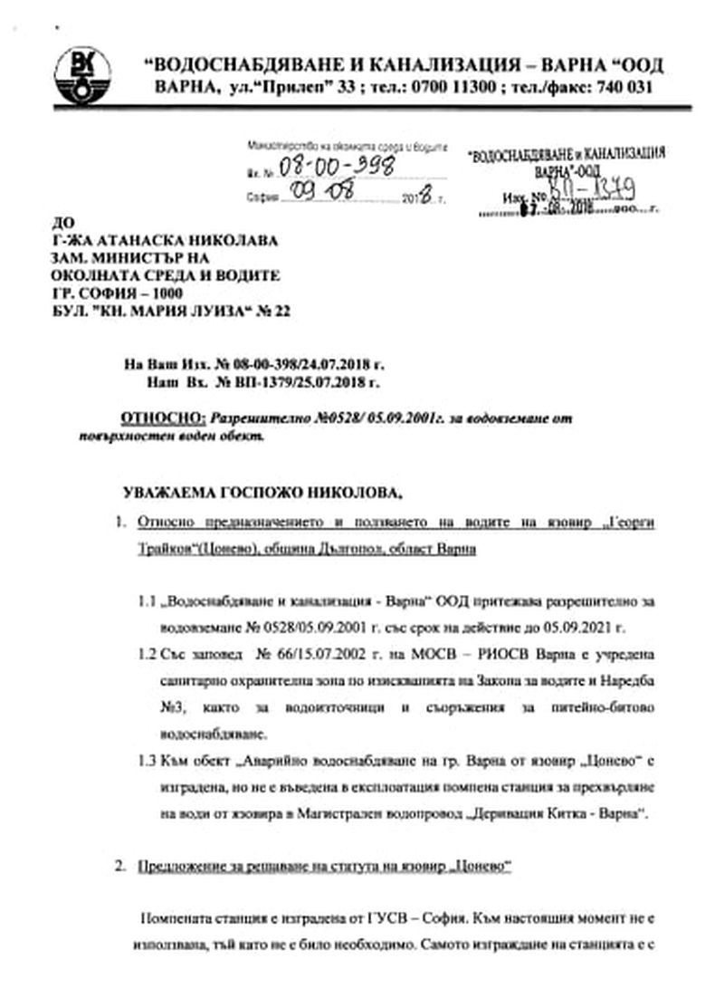 От министерството уточняват, че до 2018 г. язовир Георги Трайков/Цонево е бил предвиден за резервно водоснабдяване на гр. Варна. По този повод министър Димитров заяви, че МОСВ винаги е било на мнение, че яз. Г. Трайков трябва да остане с предназначение за резервно питейно-битово водоснабдяване. През лятото и есента на миналата година министър Димитров на няколко пъти посети язовира, за да провери състоянието му, включително помпената станция, която подава вода към канала за Варна - снимки. През последната година, за да акумулират максимално обеми в язовира МОСВ е ограничавало и спирало ползването на водни обеми от ВЕЦ-овете за енергийни цели. Разрешение и имало ВЕЦ-овете да могат да преработват само водните количества, които подават за промишлени нужди на дружествата от „Консорциум Девня“ или за напояване. В момента в яз. Г. Трайков има налични 108 млн. куб м. вода.