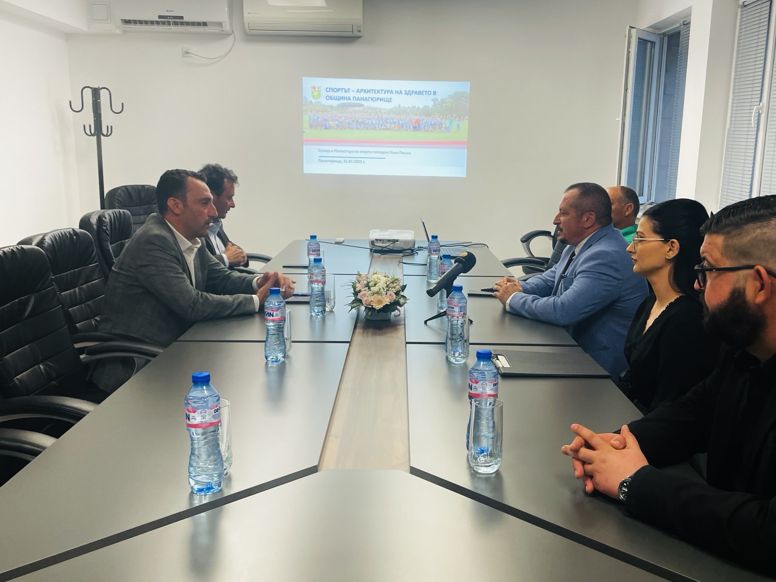 В рамките на посещението си министърът проведе среща с председателя на Асоциацията на спортните клубове в Панагюрище Иван Нетов, експерти от общинска администрация, представители на местните спортни клубове и организации, с които обсъди състоянието на спорта на местно ниво, бъдещите инициативи и възможностите за подкрепата за развитието на спорта в региона.