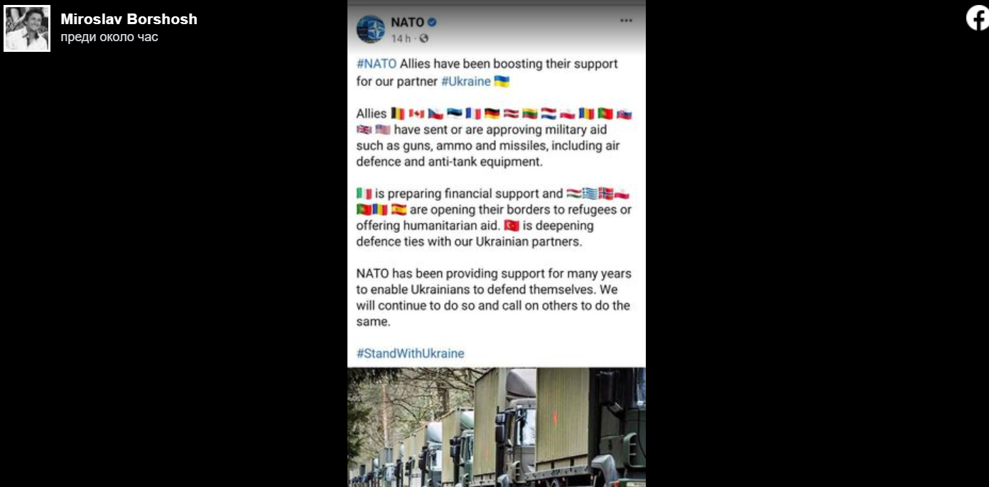 "Италия подготвя финансова подкрепа и Унгария, Гърция, Полша, Норвегия, Португалия, Испания и Румъния отварят границите си за бежанци или предлагат хуманитарна помощ. Турция задълбочава връзките в областта на отбраната с нашите украински партньори. НАТО предоставя подкрепа от много години, за да даде възможност на украинците да се защитават. Ще продължим да го правим и ще призоваваме и другите да направят същото“, пише още Боршош.