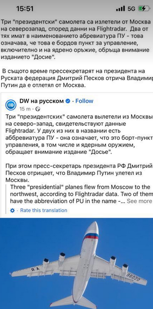 В същото време прессекретарят на президента на Руската федерация Дмитрий Песков отрича Владимир Путин да е отлетял от Москва.