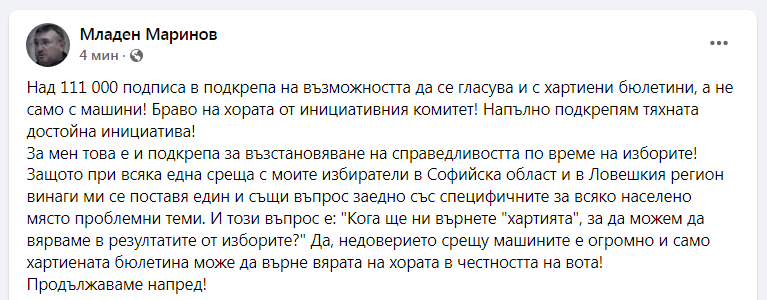 Младен Маринов: Браво на хората от инициативния комитет за гласуване с хартиени бюлетини! Продължаваме напред!