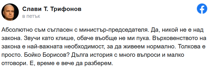 „Върховенството на закона е най-важната необходимост, за да живеем нормално“, написа Трифонов по повод задържането на лидера на опозицията Бойко Борисов. Статусът му обаче предизвика вълна от недоволство в социалната мрежа.