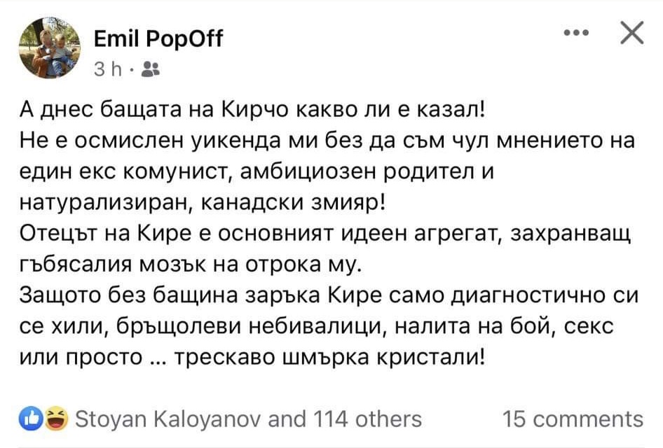 Защото без бащина заръка Кире само диагностично си се хили, бръщолеви небивалици, налита на бой, секс или просто … трескаво шмърка кристали", пише Емил Попов в социалната мрежа.