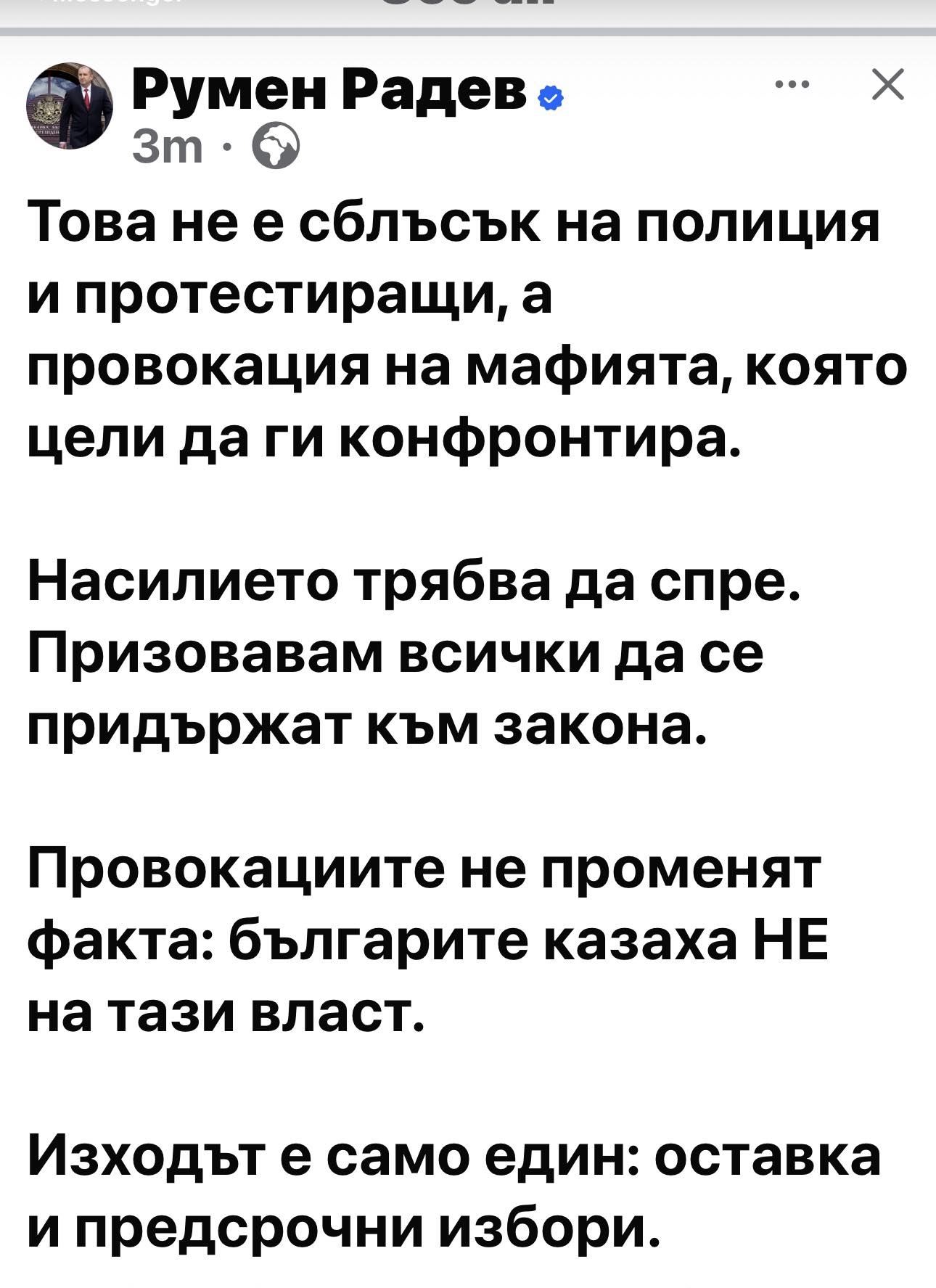 Бруталното насилие, погромите и палежите, извършвани от протестиращите в София са тероризъм. Не гражданска позиция, не гражданско право - тероризъм! Този тероризъм лиши първоначално справедивата кауза на протеста срещу бюджета от неговата морална легитимност. Това вече не е граждански протест, а открит хулигански метеж и тежко погазване на законността и обществения ред, които във всяка държава от ЕС са тежко наказуеми. Няма Gen Z, няма Gen Y и тем подобни глупотевини - случващото се е варварско безобразие, което не трябва да остава без ясен законов отговор от демократичните институции и истинското гражданско общество на България. Отговорност за всичко това носят партийното нискочелие , неговата клиентела и престъпната олигархия, която ги подкрепя дни и които наред насъскват определени обществени среди в тази посока.