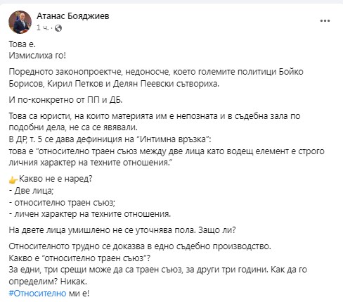 Та сега, новото им хрумване е "домашно насилие в условията на интимна връзка", да е повече насилие от другите насилия и да се наказва по-строго от тях.