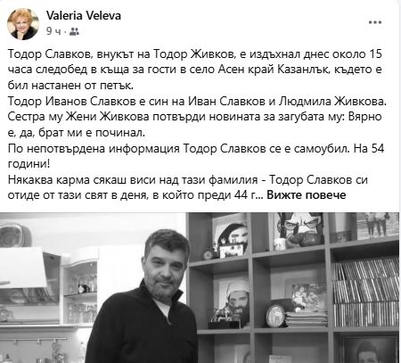 Тодор Иванов Славков – скандалният внук на Тодор Живков и син на Людмила Живкова – почина внезапно днес, на 21 юли 2025 г., в къща за гости край Казанлък. На 54 години.