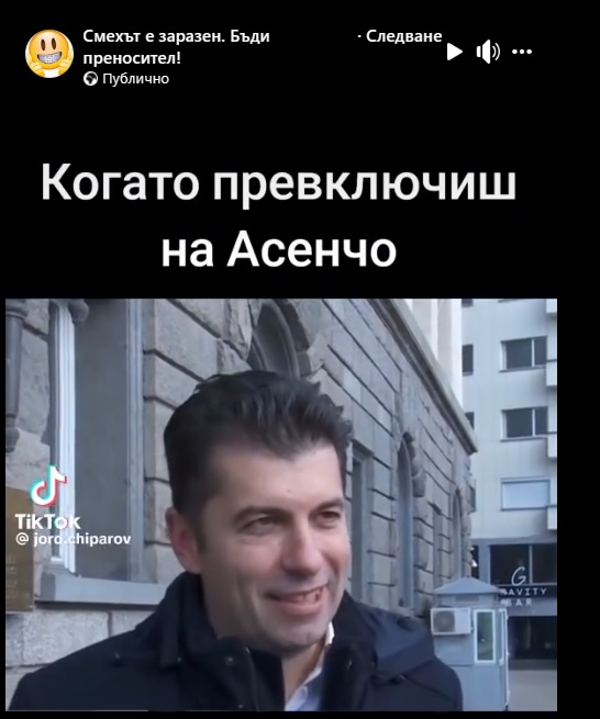 Култово видео във фейсбук групата "Смехът е здраве! Бъди преносител" с участието на съпредседателя на ППДБ Кирил Петков се споделя лавинообразно в социалната мрежа, видя ПИК.
