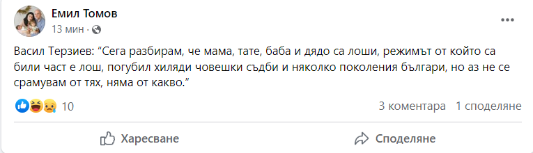 Под думите на Терзиев потресени потребители на Фейсбук кометираха с възмущение. "Няма да пишеш така срещу мама, тате и дядо!", призова го продуцентът Виктор Димчев. "Няколко поколения са погубени от комунизма у нас". Снимката на стената, която си пуснал, имената изписани там като жертви на престъпния комунистически режим, нали осъзнаваш, че хората които са те създали и отгледали са отговорни за тях. Аз по-голяма наглост не съм виждала", добива Надежда Ганева.