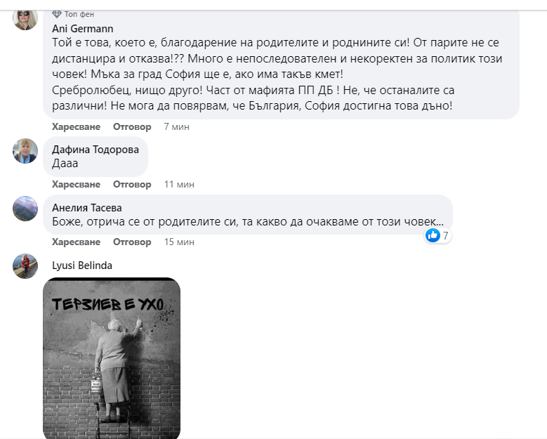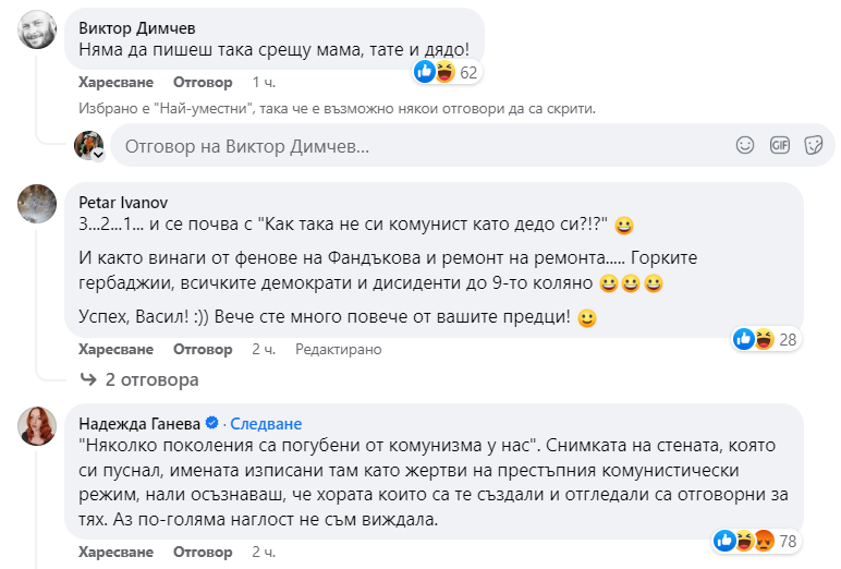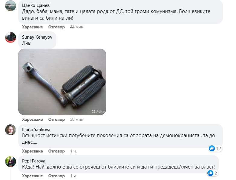 "Дядо, баба, мама, тате и цялата рода от ДС, той громи комунизма. Болшевиките винаги са били нагли!... Юда! Най-долно е да се отречеш от близките си и да ги продадеш. Алчен за власт!", коментираха и други потребители в социалката.
