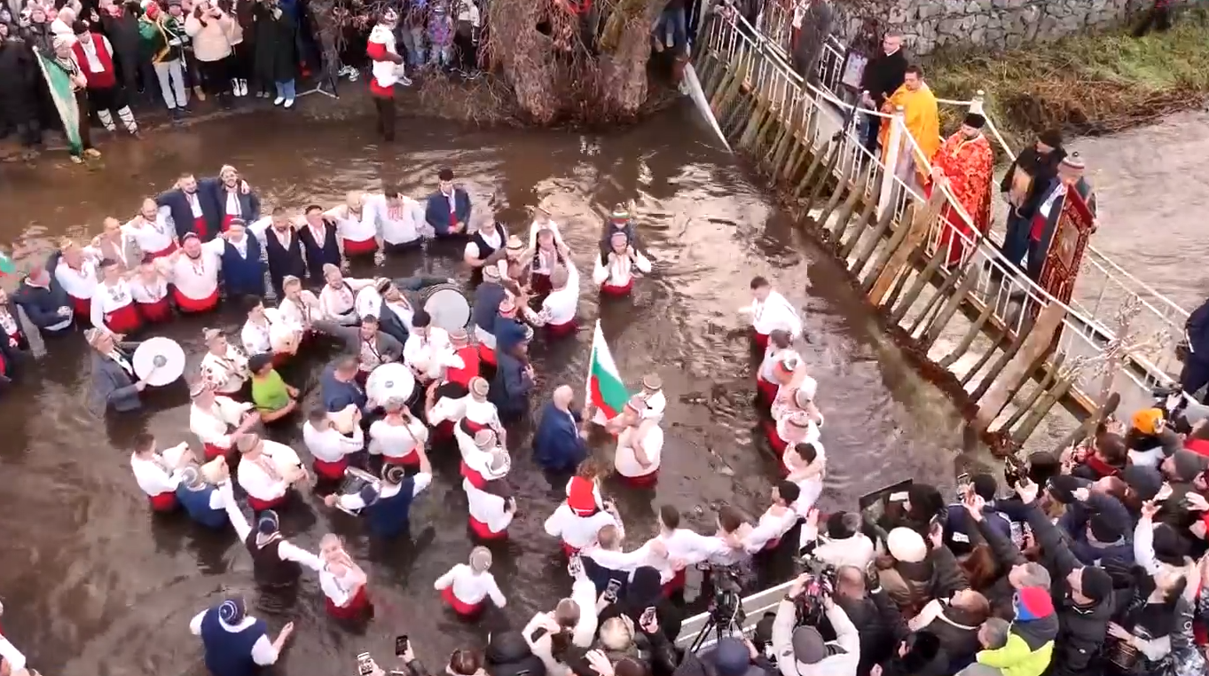 Стотици мъже и тази година се включиха в традиционното мъжко хоро на Богоявление в студените води на река Тунджа в Калофер.