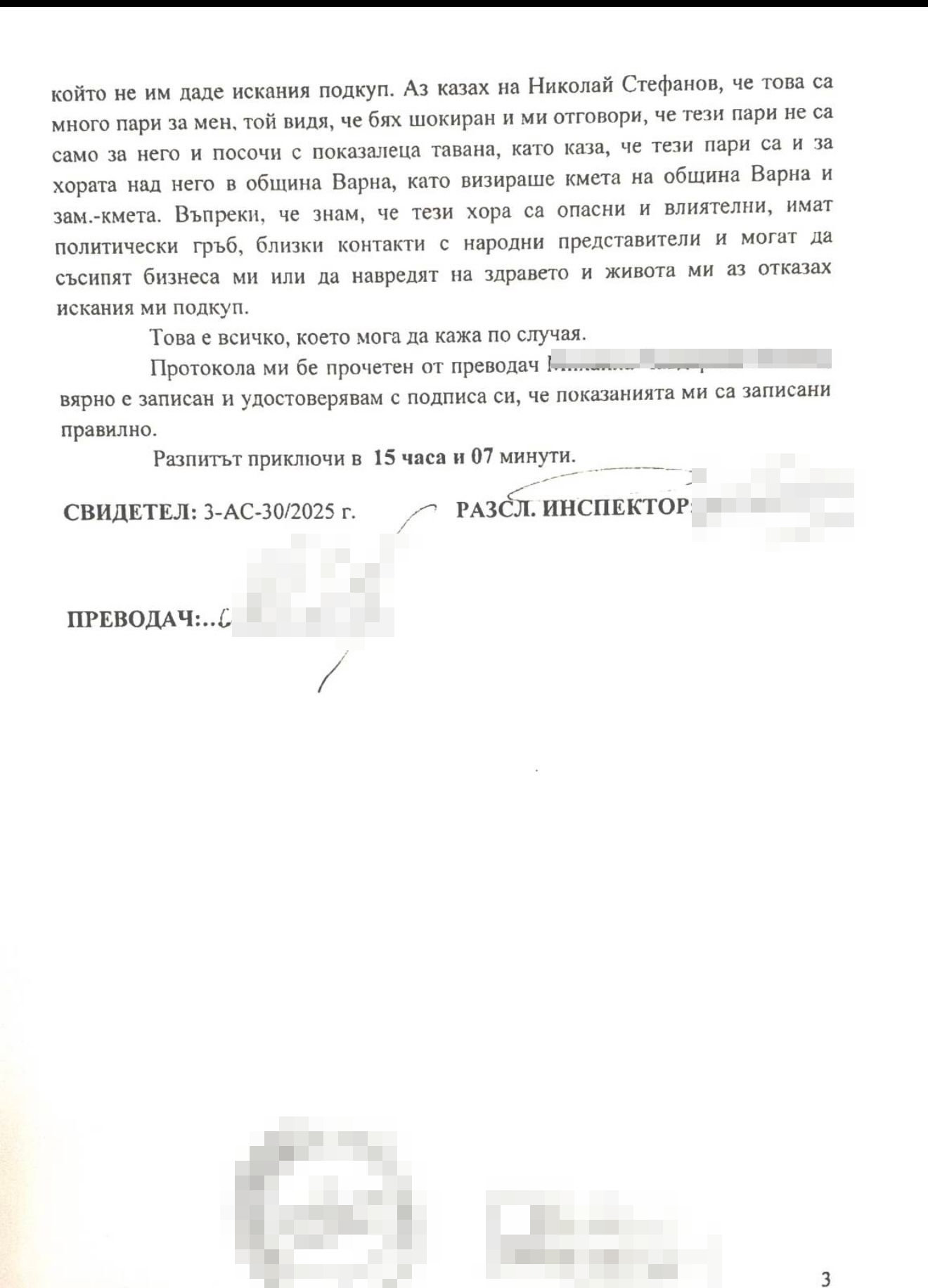 от Община Варна, както и че действат безкомпромисно и нагло срещу всеки, който не им даде искания подкуп. Аз казах на Николай Стефанов, че това са много пари за мен, той видя, че бях шокиран и ми отговори, че тези пари не са само за него и посочи с показалеца тавана, като каза, че тези пари са и за хората над него в община Варна, като визираше кмета на община Варна и зам.-кмета. Въпреки че знам, че тези хора са опасни и влиятелни, имат политически гръб, близки контакти с народни представители и могат да съсипят бизнеса ми или да навредят на здравето и живота ми, аз отказах искания ми подкуп.