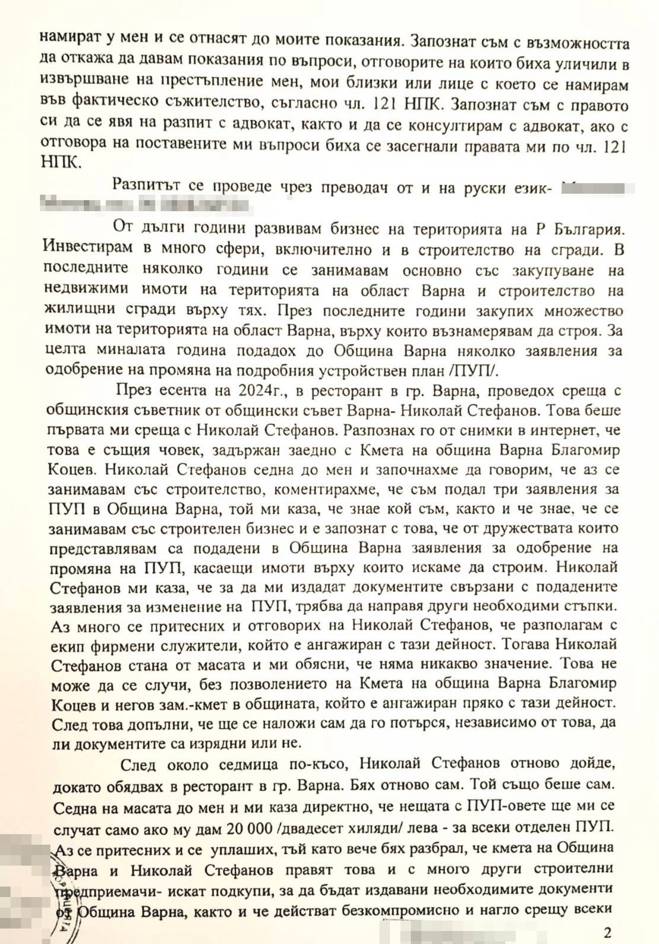 През есента на 2024 г., в ресторант в гр. Варна, проведох среща с общинския съветник от общински съвет Варна - Николай Стефанов. Това беше първата ми среща с Николай Стефанов. Разпознах го от снимки в интернет, че това е същия човек, задържан заедно с kмета на община Варна Благомир Коцев. Николай Стефанов седна до мен и започнахме да говорим, че аз се занимавам със строителство, коментирахме, че съм подал три заявления за ПУП в Община Варна, той ми каза, че знае кой съм, както и че знае, че се занимавам със строителен бизнес и е запознат с това, че от дружествата, които представлявам, са подадени в Община Варна заявления за одобрение на промяна на ПУП, касаещи имоти, върху които искаме да строим. Николай Стефанов ми каза, че за да ми издадат документите, свързани с подадените заявления за изменение на ПУП, трябва да направя други необходими стъпки.