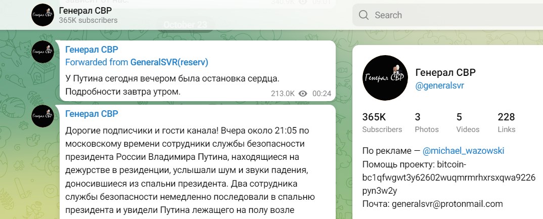 Многократно се говореше за влошаване на здравето на Путин в областта на онкологията и редица други заболявания. Случаят на сърдечен арест сериозно разтревожил близкото обкръжение на президента, въпреки факта, че лекуващите лекари вече предупредили, че Путин е много болен и е малко вероятно да доживее до края на есента.