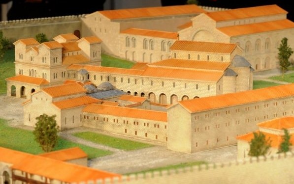 Големият царски дворец във Велики Преслав и Дворцовата църква на преден план (макет)