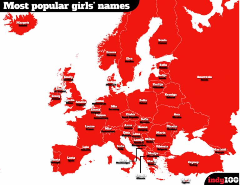Според британския Independent на-популярните бебешки имена в Европа твърдо зависят от региона. София доминира на Стария континент на изток, докато Ема е популярна на запад.