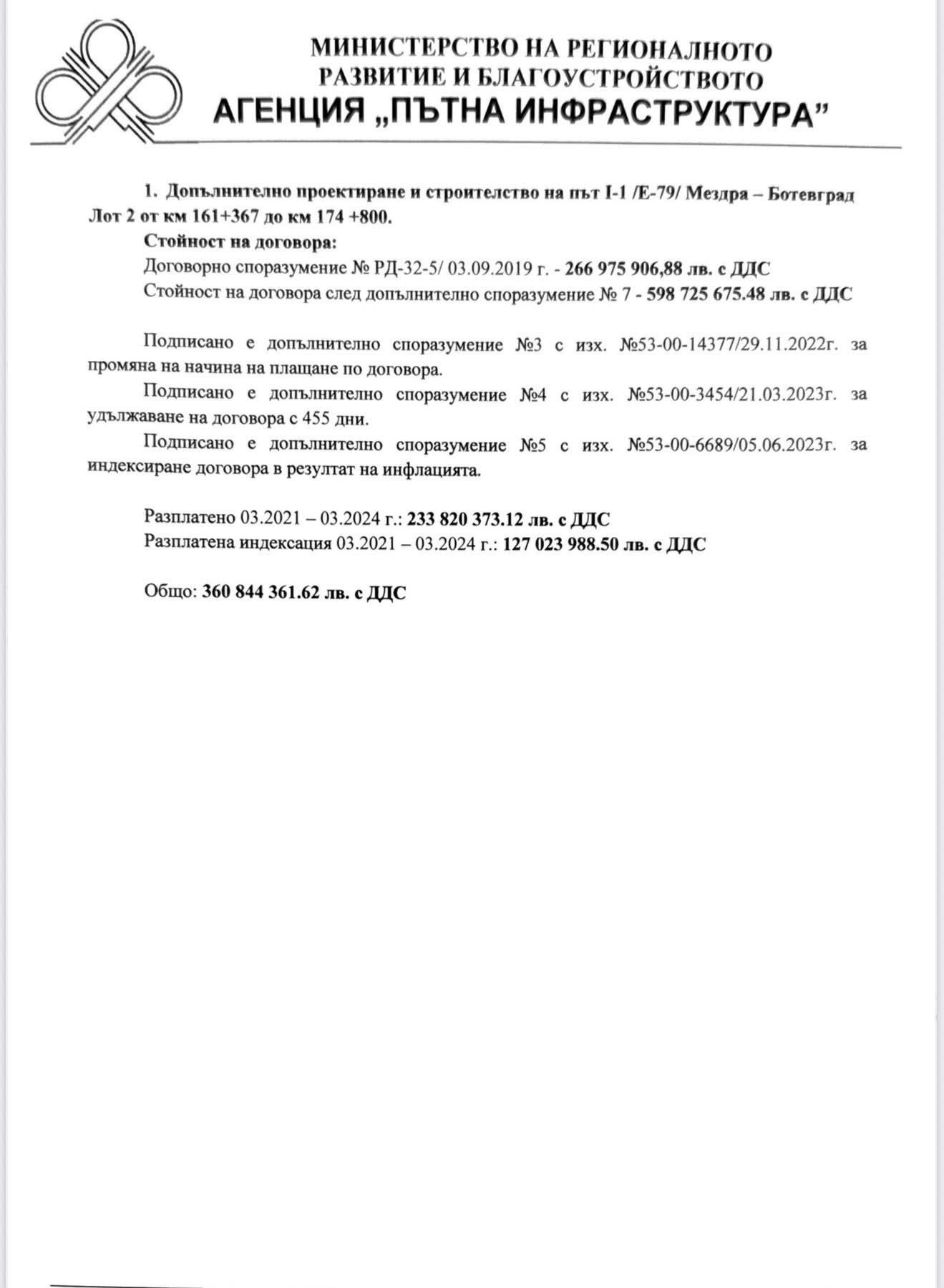 - А с различни процедурни хватки стойността на договора е била увеличена над два пъти в периода 2022 - 2024 г. От 270 млн. лв. на почти 599 млн. лв. (вижте приложените документи).