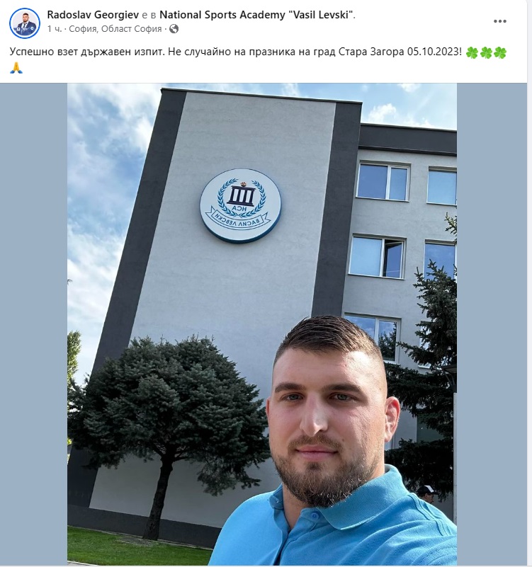 Георгиев, който често е забелязван като част от младежите, които съпътстват лидера Бойко Борисов почти навсякъде, се похвали в профила си в социалната мрежа Фейсбук, че си е взел държавния изпит в НСА.