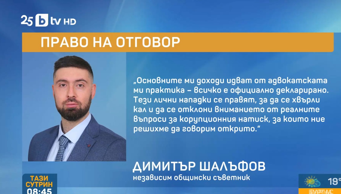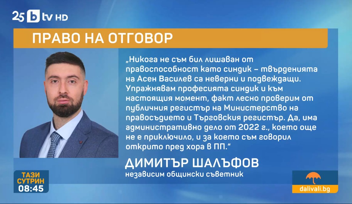 Напусналият ПП общински съветник Димитър Шалъфов поиска право на отговор по бТВ, за да отвърне на нападките на Асен Василев преди дни.
