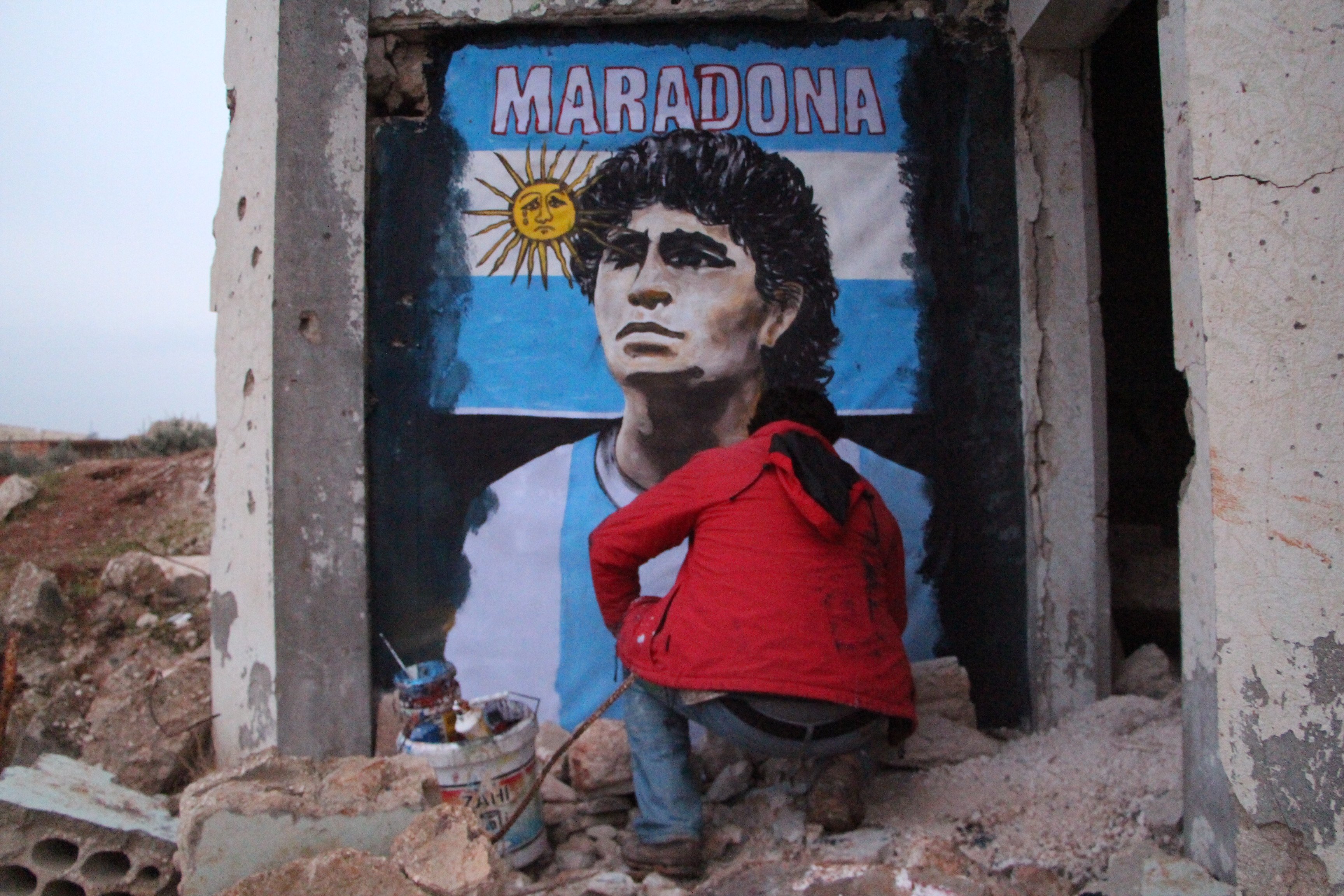 В почти напълно разрушения град Идлиб, художник нарисува портрет на футболиста върху руините на сграда. С графита, сириецът се надява да върне хубавите спомени на съгражданите си от времето, когато и те са имали възможност да играят футбол.