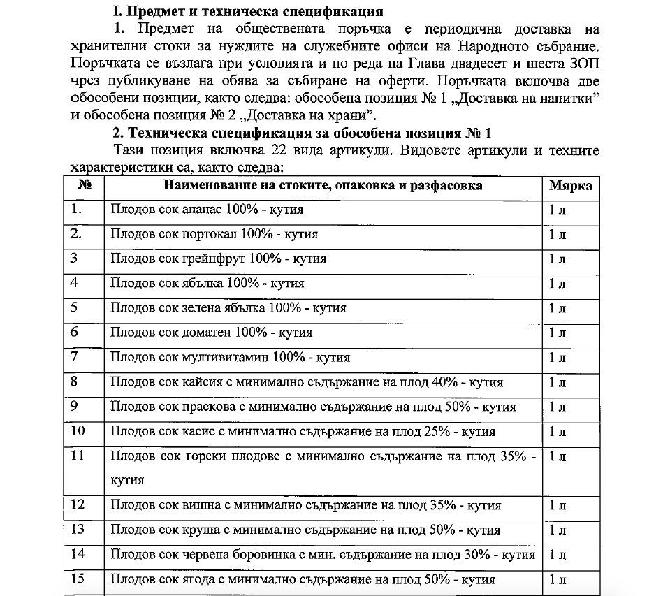 Разходите за безалкохолни напитки, натурални сокове, нектари, чай и бонбони, докато народните представители са ангажирани с работата си в служебните кабинети и стаите на парламентарните групи, се поемат от бюджета. Това се разбира от обявена от администрацията на Народното събрание обществена поръчка, предаде репортер на БГНЕС. Парламентът купува служебните кафета на законодателите, докато участват в заседанията на парламентарните комисии. 14 000 лв. без ДДС струва на данъкоплатците доставката на газирани безалкохолни напитки, натурални сокове и нектари.