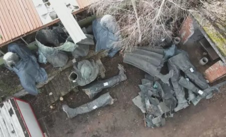 Парчетата от трите фигури от върха на паметника - съветският войник с автомат, майка с дете и български работник, са разпръснати зад хале. Всички те са маркирани, някои са увити в найлон. Всяка една от частите тежи до 5 тона.