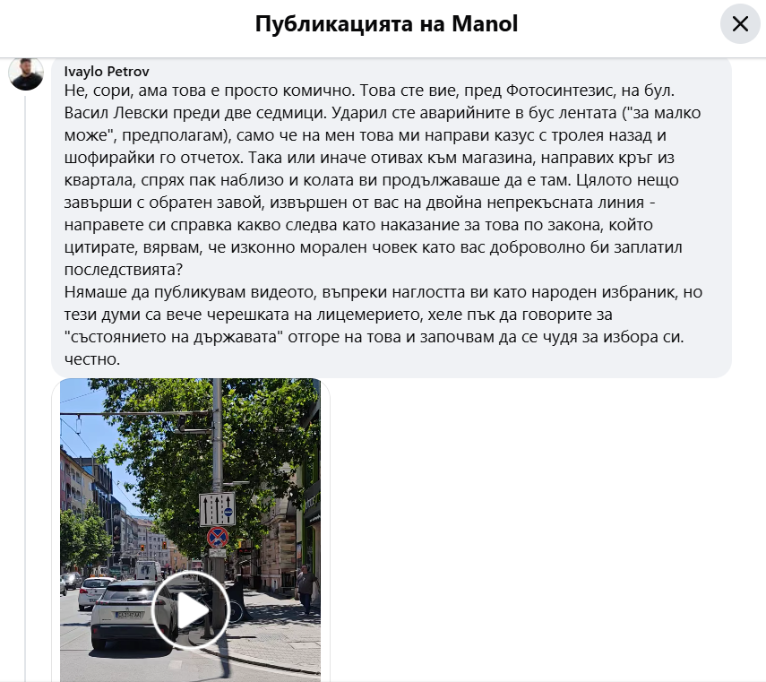 "Цялото нещо завърши с обратен завой, извършен от вас на двойна непрекъсната линия - направете си справка какво следва като наказание за това по закона, който цитирате, вярвам, че изконно морален човек като вас доброволно би заплатил последствията? Нямаше да публикувам видеото, въпреки наглостта ви като народен избраник, но тези думи са вече черешката на лицемерието, хеле пък да говорите за "състоянието на държавата" отгоре на това и започвам да се чудя за избора си. Честно", възмути се младият мъж.