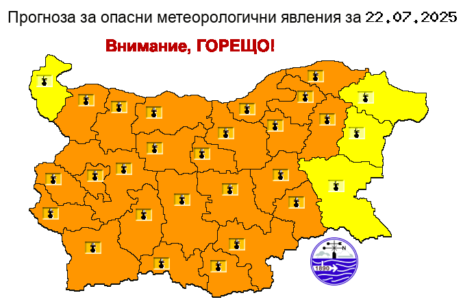 През днешния ден времето ще бъде още по-горещо от вчера. В почти цялата страна е обявено предупреждение от втора степен, код оранжево, за максимални температури от 38° до 42°, в София, както и в крайните северозападни части от страната - около 37°. Ще се задържи слънчево, след обяд над планинските райони с временни увеличения на облачността.