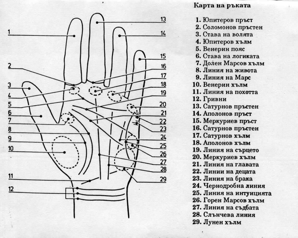 Показваме ви карта на дланта, за да ви е максимално лесно да се ориентирате в описанието.