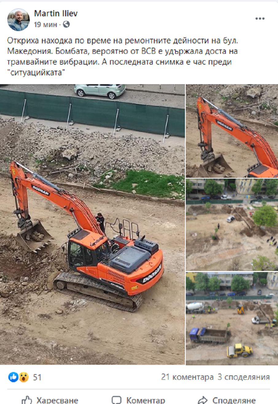 Откриха находка по време на ремонтните дейности на бул. Македония в столицата. Бомбата, вероятно от Втората световна война и е удържала доста на трамвайните вибрации. Това съобщава във фейсбук групата „Видяно в София“ Мартин Илиев.