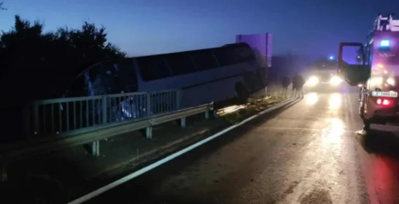 По първоначална информация автобусът се е движел в посока Харманли, когато в неговото платно се включил тежкотоварният автомобил. При опит да избегне по-сериозен сблъсък, шофьорът на автобуса завил рязко, вследствие на което превозното средство излязло от пътя и спряло надвиснало над дере, предаде Нова телевизия.