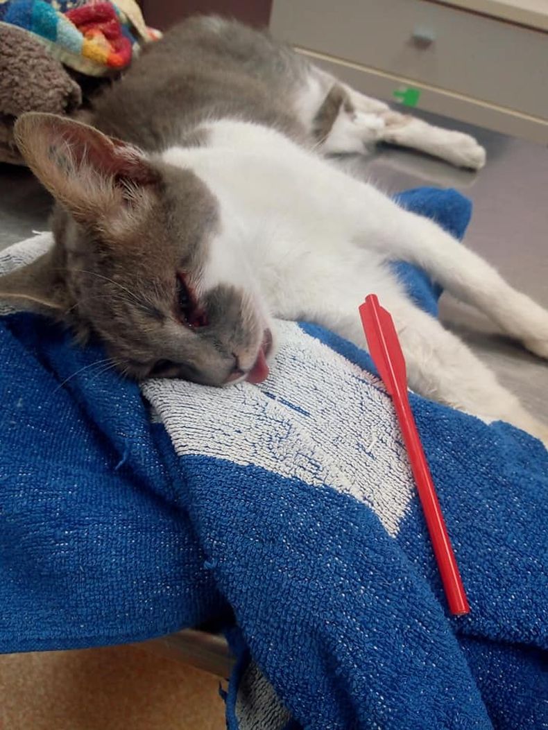 "Изроди! Това е коте, което храня от две години! А това до него е стрела, която беше забита в окото му. Какво ви направи, как ви подразни? Добре, че приятелка ми се обади, благодаря и на Тошко, че дойде с мен до клиниката", добави в социалната мрежа Костадинка.