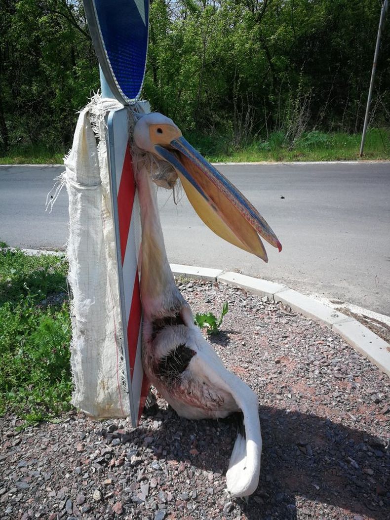 Снимки на мъртъв розов пеликан, завързан на пътен знак край Раднево, предизвикаха гневни реакции в социалните мрежи. Причината за смъртта е токов удар.