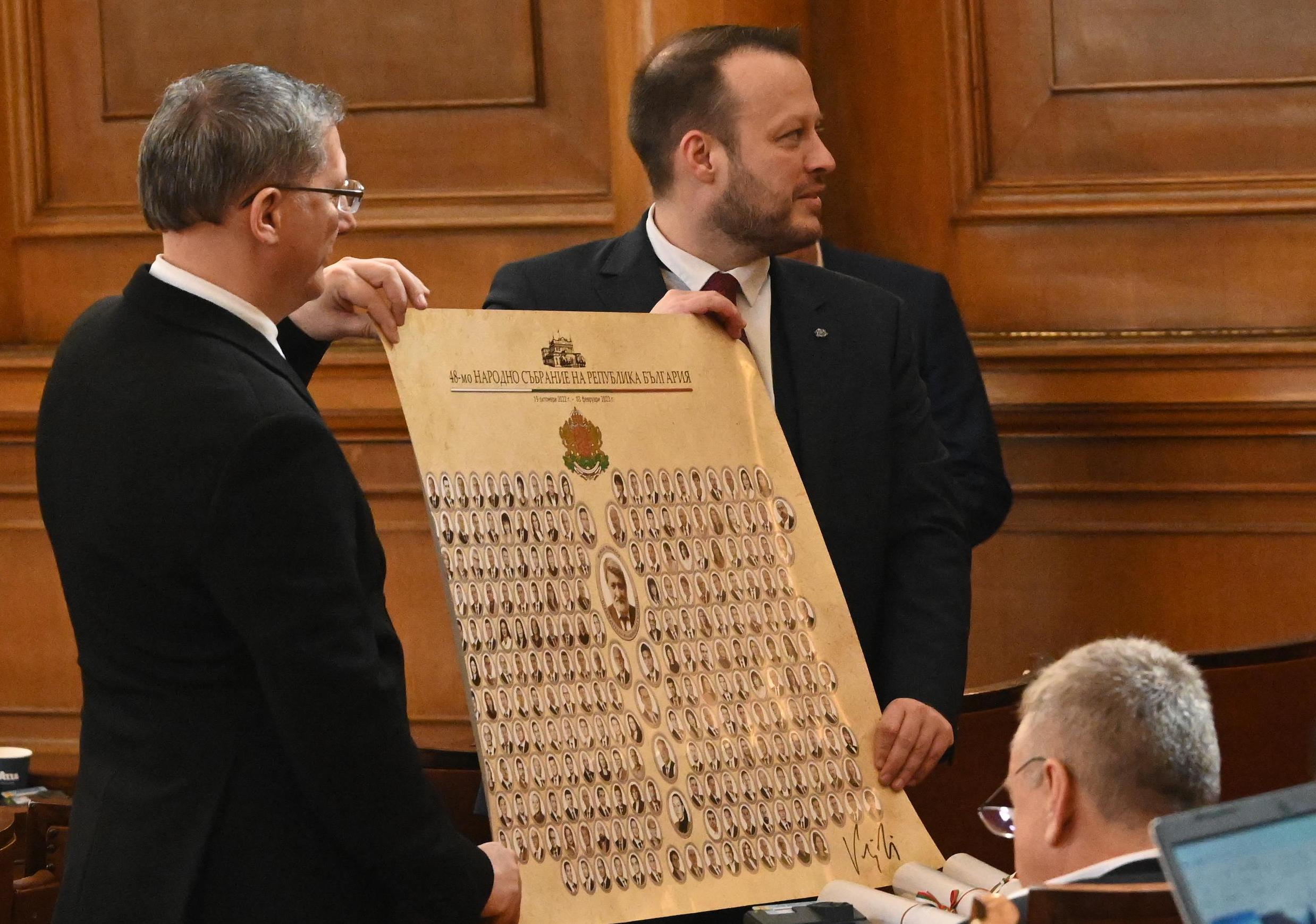 "Свитъците са по идея на председателя на Народното събрание господин Вежди Рашидов за възобновяване на една традиция, която е започнала с учредителното Народно събрание - да се прави такъв общ портрет с всички народни представители и ръководството на Народното събрание", съобщи председателстващия заседанието Йордан Цонев.