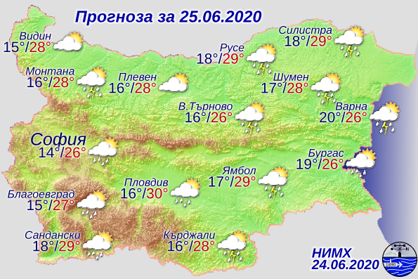 През днешния ден ще преобладава слънчево време, като отново в часовете около и след обяд ще се развие купеста и купесто-дъждовна облачност и на места ще превали и прегърми. По-голяма вероятност за обилни валежи и градушки има в Североизточна България. Ще духа слаб до умерен североизточен вятър. Максималните температури ще са между 25° и 30°. Атмосферното налягане ще се задържи по-високо от средното за месеца. Това съобщават от Националния институт по метеорология и хидрология (НИМХ)