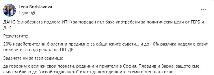 Лена Бориславова очевидно кара много леко майчинство, тъй като ежедневно намира време за политически публикации в профила си във Фейсбук, видя ПИК.