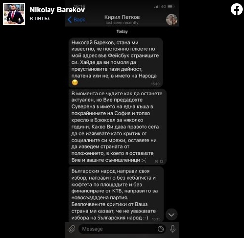 Предполагаема кореспонденция на премиера Кирил Петков до Николай Бареков публикува бившият евродепутат.