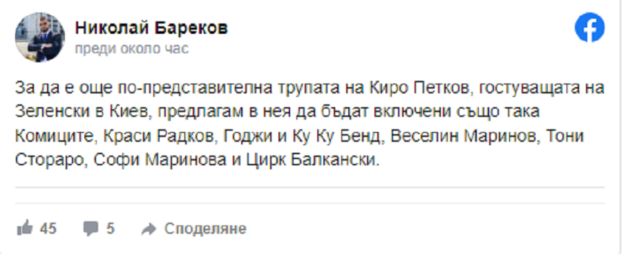 “За да е още по-представителна трупата на Киро Петков, гостуващата на Зеленски в Киев, предлагам в нея да бъдат включени също така Комиците, Краси Радков, Годжи и Ку Ку Бенд, Веселин Маринов, Тони Стораро, Софи Маринова и Цирк Балкански“.