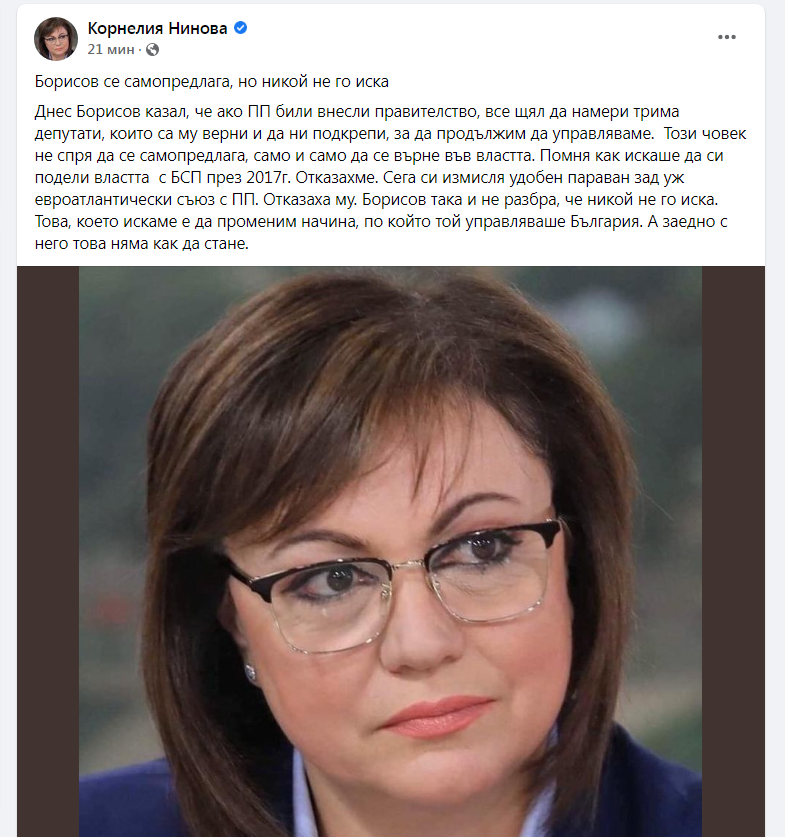 „Днес Борисов казал, че ако ПП били внесли правителство, все щял да намери трима депутати, които са му верни и да ни подкрепи, за да продължим да управляваме. Този човек не спря да се самопредлага, само и само да се върне във властта. Помня как искаше да си подели властта с БСП през 2017г. Отказахме. Сега си измисля удобен параван зад уж евроатлантически съюз с ПП. Отказаха му. Борисов така и не разбра, че никой не го иска. Това, което искаме, е да променим начина, по който той управляваше България. А заедно с него това няма как да стане”, написа тя.