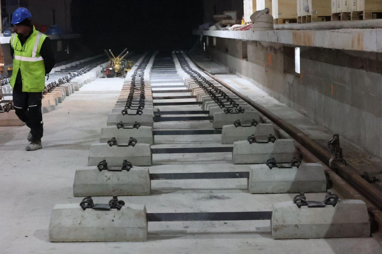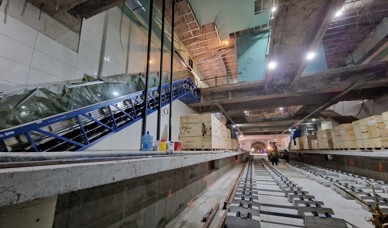 Ескалаторите са монтирани, преградните стени за пероните са доставени и очакват своя ред за монтаж. Синият цвят присъства навсякъде по стените и настилките, по които също се работи активно.