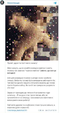 "Казват ми, че правя някаква черна магия. Естествено, това са измислици. Но за разтоварване на психиката, тази вечер направих вуду кукла. Съжалявам, трябва да замаскирам снимката на главата на куклата. Има снимка на нашия общ враг, който започна война срещу Украйна. Всички много добре знаете кой е там! Сега отивам до куклата и вкарвам игла в нея. И става по-лесно на душата, за да не спирате дори за секунда и да вършите работата си възможно най-ефективно“, пише Илашчук в коментар към снимката.