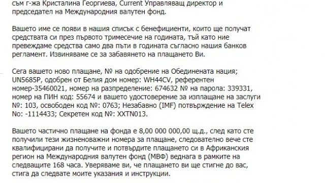 В писмото менте се обяснява, че като бенефициент на фонда четящият пред компютъра ще получи дълго чакани средства за първото тримесечие на годината. Представящият се за Кристалина Георгиева се извинява за забавянето на милиардите и съобщава, че частичното плащане вече е подготвено и е на стойност 8 млрд. щатски долара.
